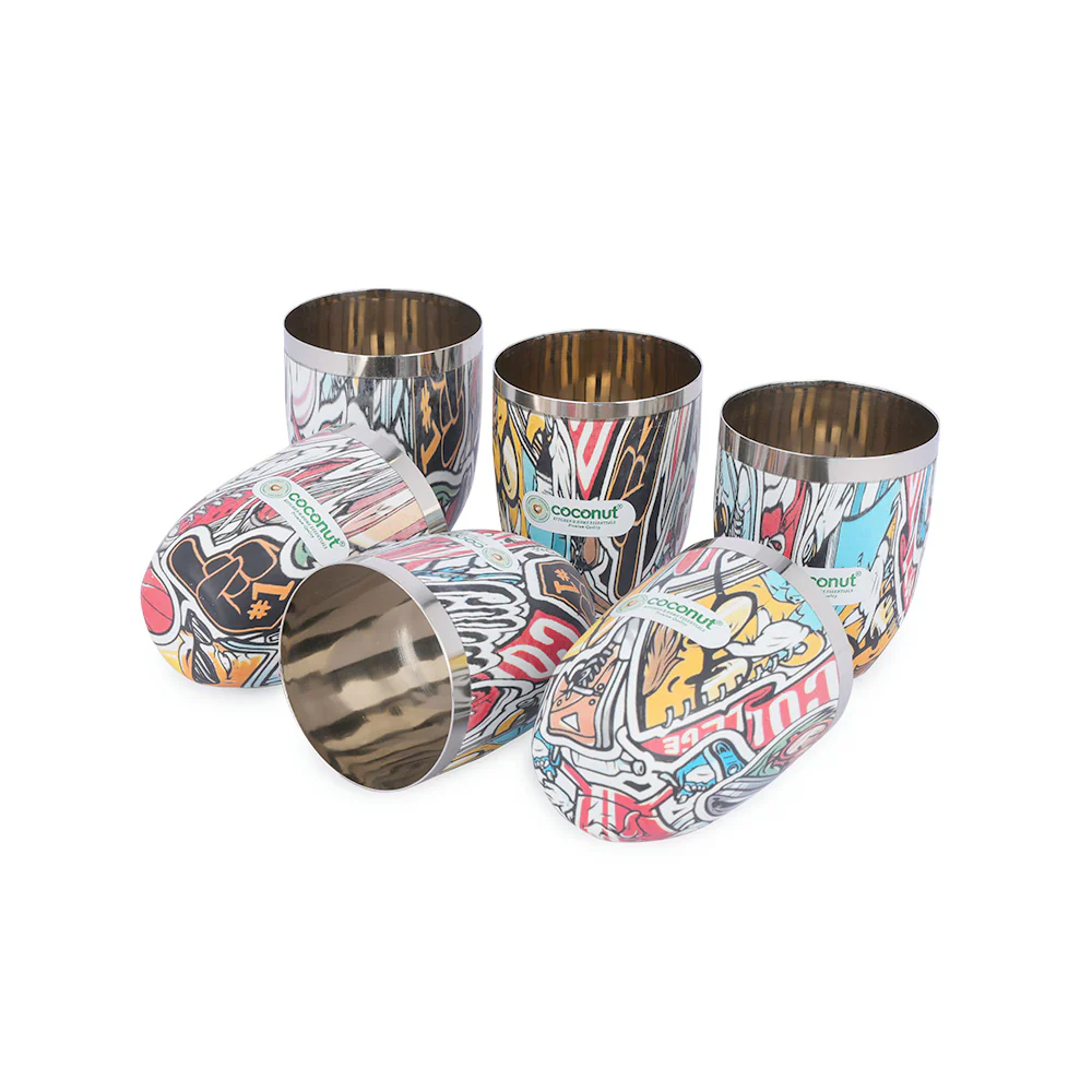 Coconut Stainless Steel Printed Designer Multi Color Water Glass/Tumbler – Capacity -300ML Pack of 3