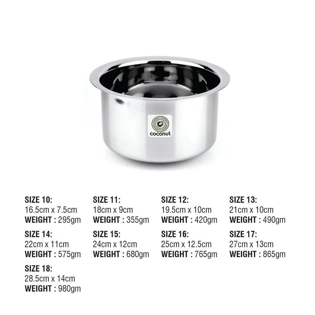 Coconut Stainless Steel Tope / Patila / Pan – 22 Gauge, Mirror Finish, Induction base / Gas Base, Model – Plain Patila Size 16