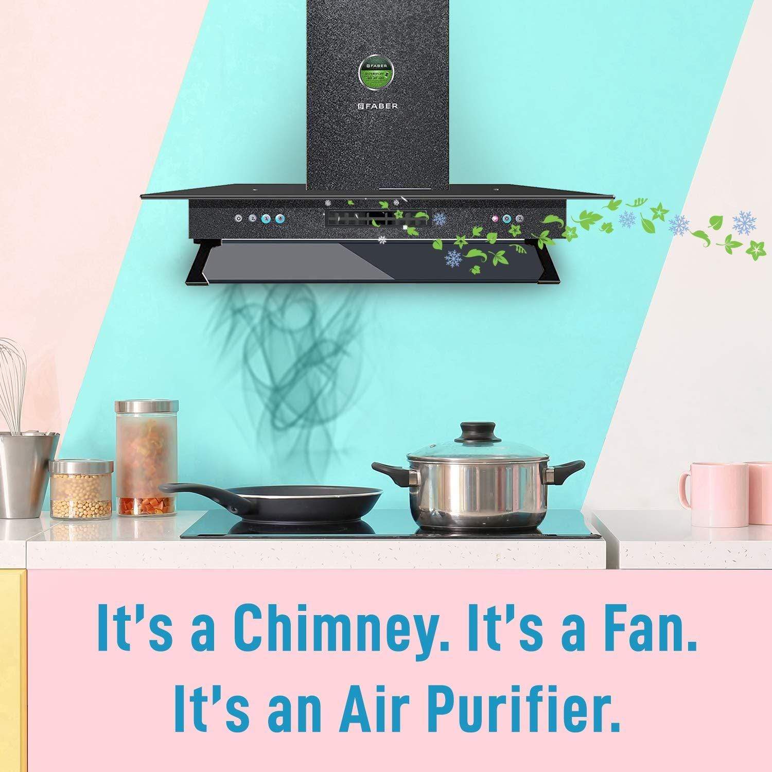 Details: Does anybody wonder how women cook food in hot summers in kitchen ? Yes, We do ….. Presenting Faber’s next generation Chimney which is a Chimney, a Fan and an Air Purifier.While cooking it will take all the smoke out from your kitchen with 1000m3/hr Suction power.Hepa filter inside the chimney will trap all harmful particles such as dust, smoke, pollen..etc and purfires the air and the Fan inside the Chimney gives you spot cooling purified air.The chimney is loaded with 2 Motors, separate for Suction and Fan to ensure both the Suction and Spot cooling can happen independently. The three layer Hepa filter gives efficiency upto 95%. Different texture available to differentiate from traditional steel and black color, which gives fresh look to your kitchen.