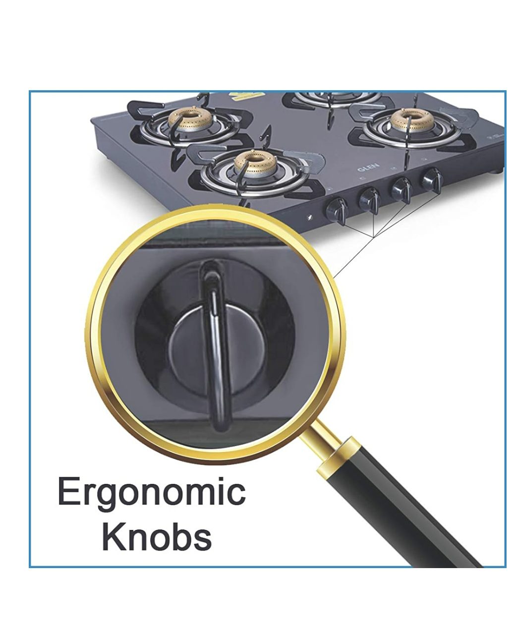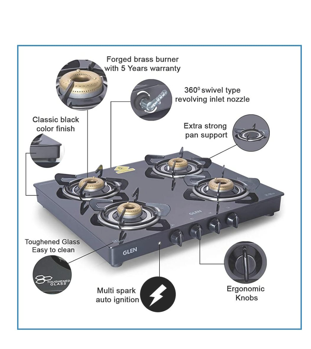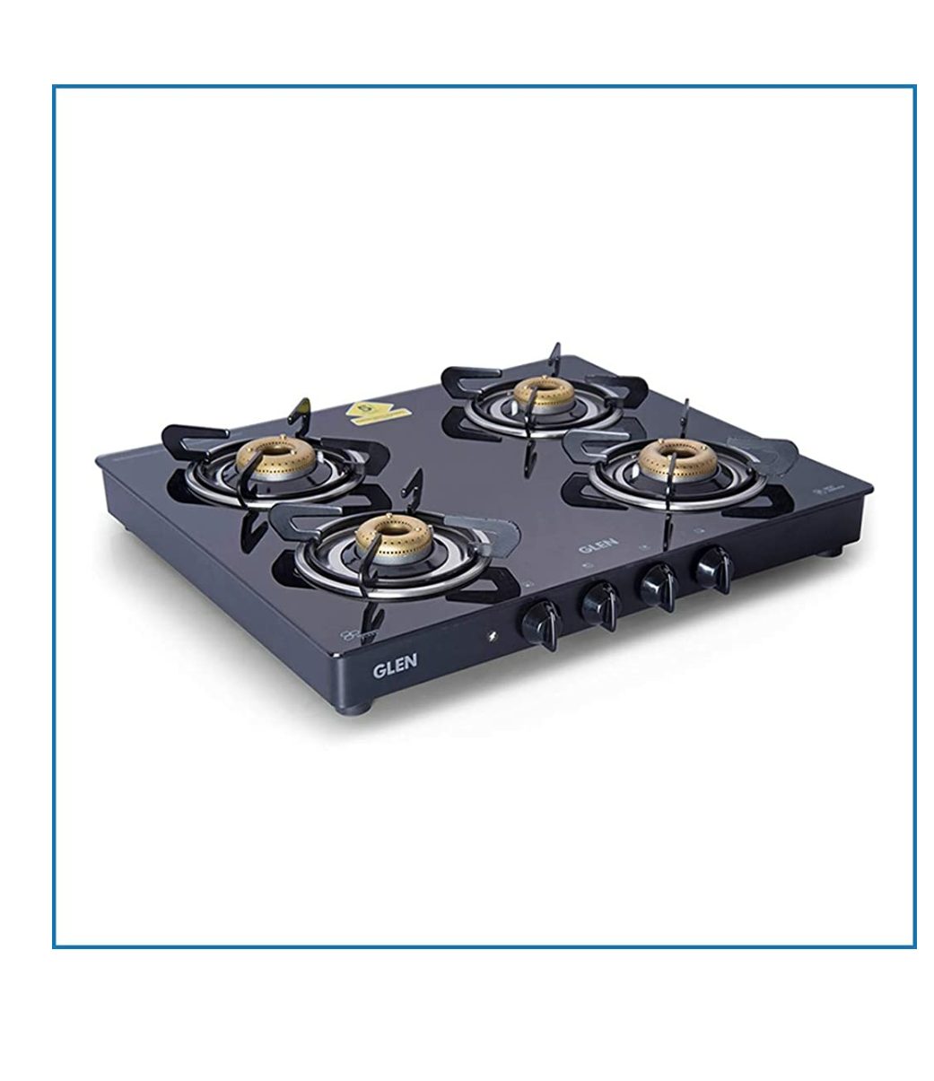 The Glen 1041 Black AI gas stove with 4 burners is a smart upgrade to your conventional gas stove. It has black powder coated body with toughened black glass top. It comes with 2 big and 2 small burners. It has sturdy pan supports and stainless steel drip tray to clean the spill over easily. Having multi spark auto ignition, this cooktop eliminates the usage of lighter or matchstick. Equipped with forged brass burners, this cooktop is best asset in longer run. The ergonomic knobs with firm grip ensures swift operation.