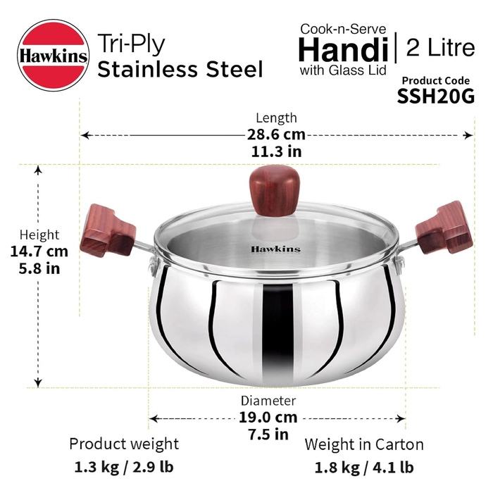 Hawkins Cook n Serve Handi, Triply Stainless Steel Handi with Glass Lid, Induction Sauce Pan, Biryani Handi, Saucepan, Silver 18 Cm | 2 Ltr