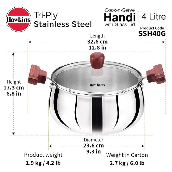 Hawkins Cook n Serve Handi, Triply Stainless Steel Handi with Glass Lid, Induction Sauce Pan, Biryani Handi, Saucepan, Silver 22 Cm | 4 Ltr