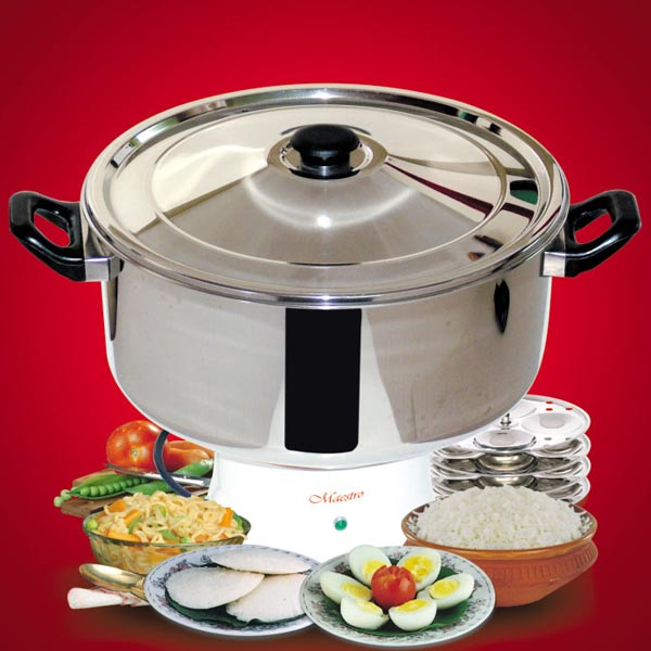 Maestro Model MC 7, A Large Volume Model, has a 7 liter. Cooking Vessel, A 4-plate Idli Stand, SS Drip Tray, SS Spatula & Egg Tray besides a Heating Base Unit. Cooks Rice up to 1.6 kg. at a time, boils vegetables up to 1.5 kg. and boils Milk up to 7 liters.