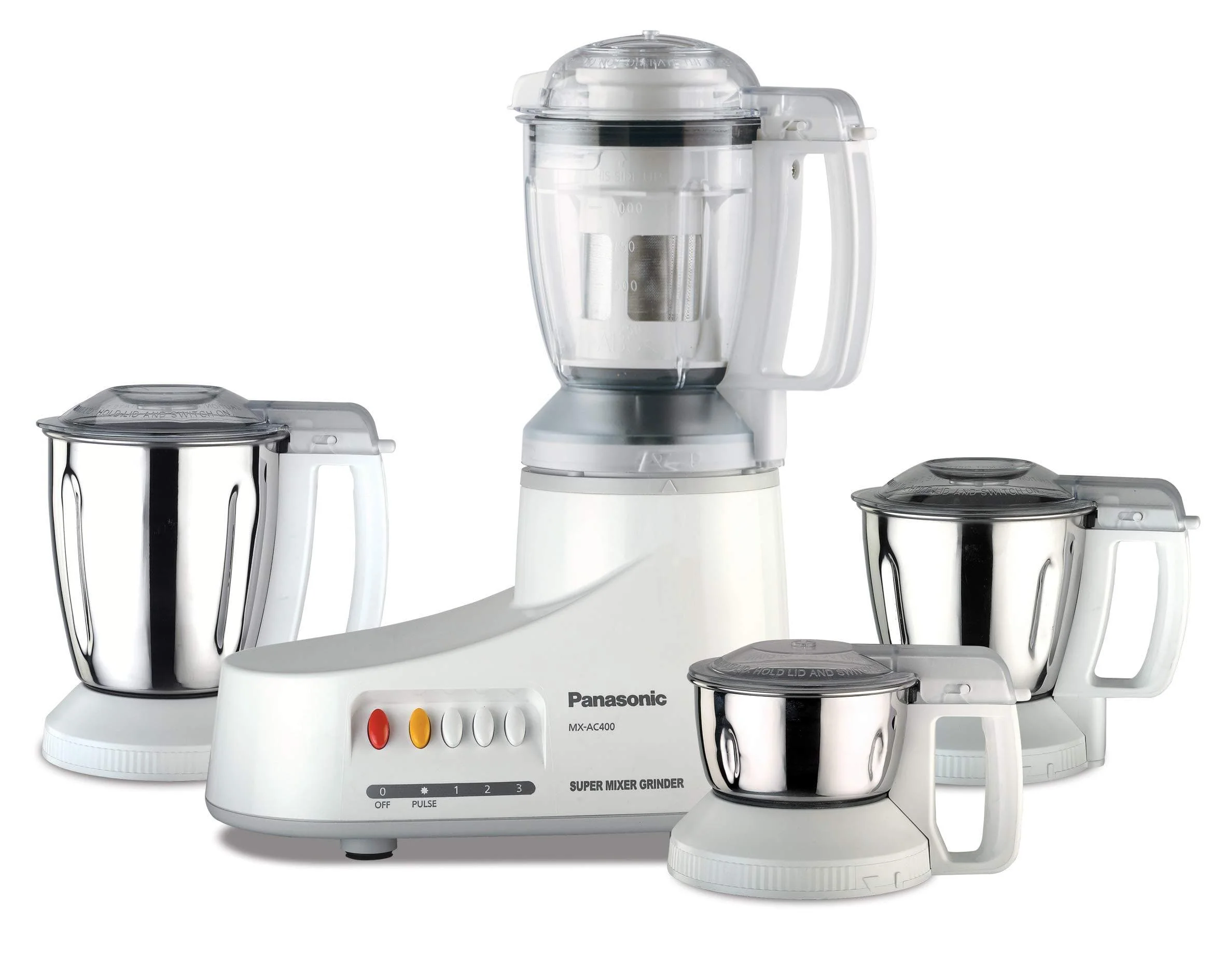 Panasonic MX-AC460 White Double safety locking mixer ginder with Three Stainless Steel Jar & One Juicer Extractor Jar (Chutney Jar, Grining Jar, Blending Jar & Polycarbonate Juice Extrator Jar).